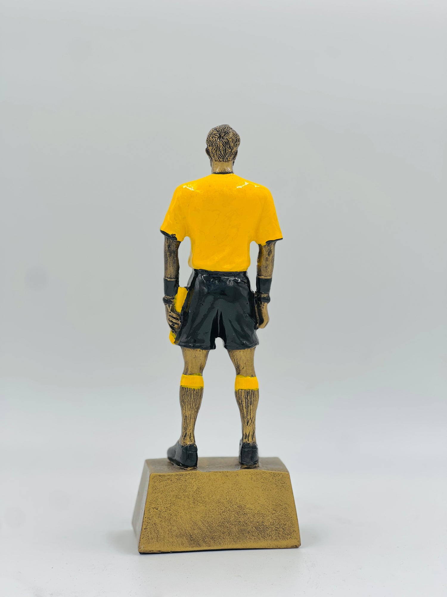 - A: This trophy is specifically designed to represent a **referee or match official**, distinguished by the classic yellow shirt and black shorts uniform and the formal standing posture.
